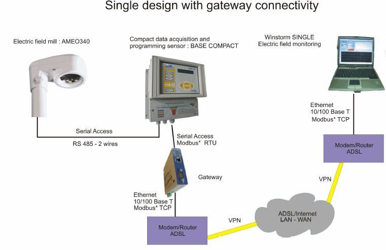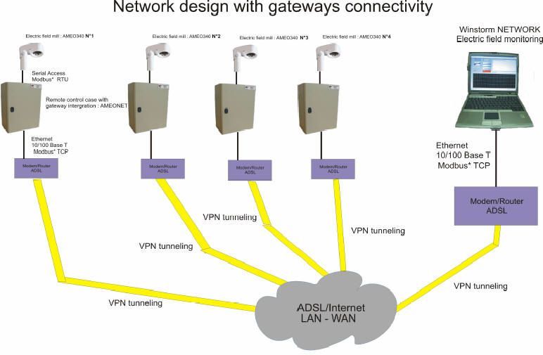 AMEO 多探头雷电侦测网的网络结构: 目前,AMEO 多探头雷电侦测网是由4个放在不同位置的AMEO 340 探头来组建的(这是初始阶段,未来可达到16个探头的连接)。 AMEO 340 探头距离区域中心点约20km,该侦测网可以覆盖约3000 km 2 的无电场障碍区域。每个AMEO 340 可在半径为15 km 范围内实时测量周围环境的电场。根据雷电气候条件的变化,AMEO 340 从量上来判定风险程度。一旦超过风险临界值,它将立即通知负责雷电侦测网的操作人员。 所有信息基本上都是实时的。 时间上的延误取决于Internet 网的传输时间,以及接入网络的Ethernet/ADSL终端设施的质量。 配有监控软件Winstorm Reseau 的中央监控, 使操作者可借助于程序手段来判断雷电威胁,从而有足够的超前时间来保护工业设施与警示在风险场合作业的人们。 中央监控与AMEO 340 之间的信息传递是一种主-从式交换。中央监控周期性地向不同的AMEO 340 发出搜寻指令,接到指令后,每个AMEO 340 按照IP 格式回答与其有关的询问。 通过INTERNET 网点TCP/IP (或SNMP)传递的数据格式是采用Modicom ModBUS TCP 协议。在AMEO 340TM 技术资料中有ModBUS交换表。 雷电侦测网的组成需要在AMEO 340 探头内与监控器中放置ADSL Modem 路由器。 |