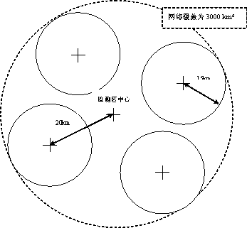 四探头雷电侦测网的平面布局图: 4个侦测探头均匀地放在要监视的区域。每个探头到区域中心的直接距离约20km 。每个探头监视的区域半径约为15km。4个探头监视的区域总面积约3000km 2。 |