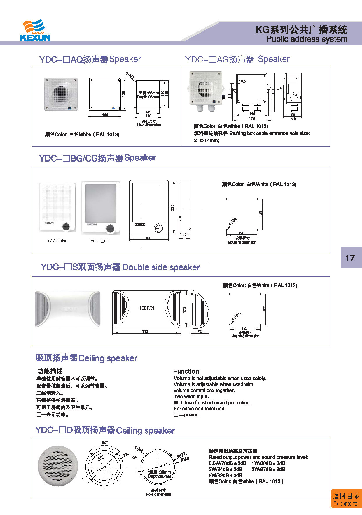 | 17 | YDC-□CG | 扬声器(0.5/1/2/3/5W)(壁挂式) Speaker(0.5/1/2/3/5W)(Wall mount) | 阻燃ABS Fire retardant ABS | 0.6Kg | IP 44 | 点击进入 Click to enter |