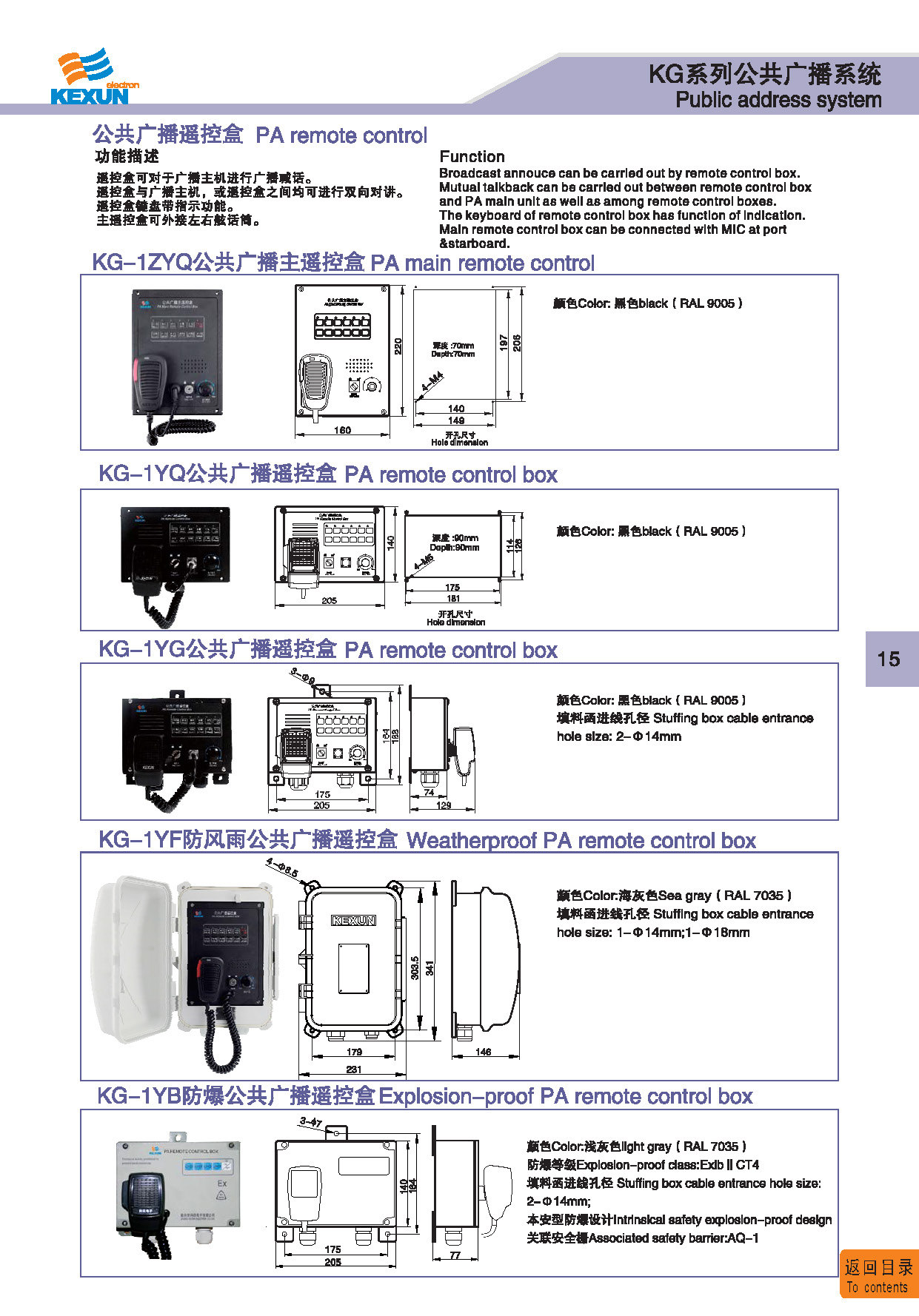 | 6 | KG-1YF | 防风雨公共广播遥控盒 Weatherproof PA remote control box | 阻燃ABS | 2.0Kg | IP 56 | 点击进入 Click to enter |